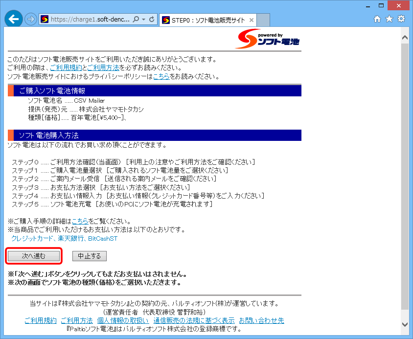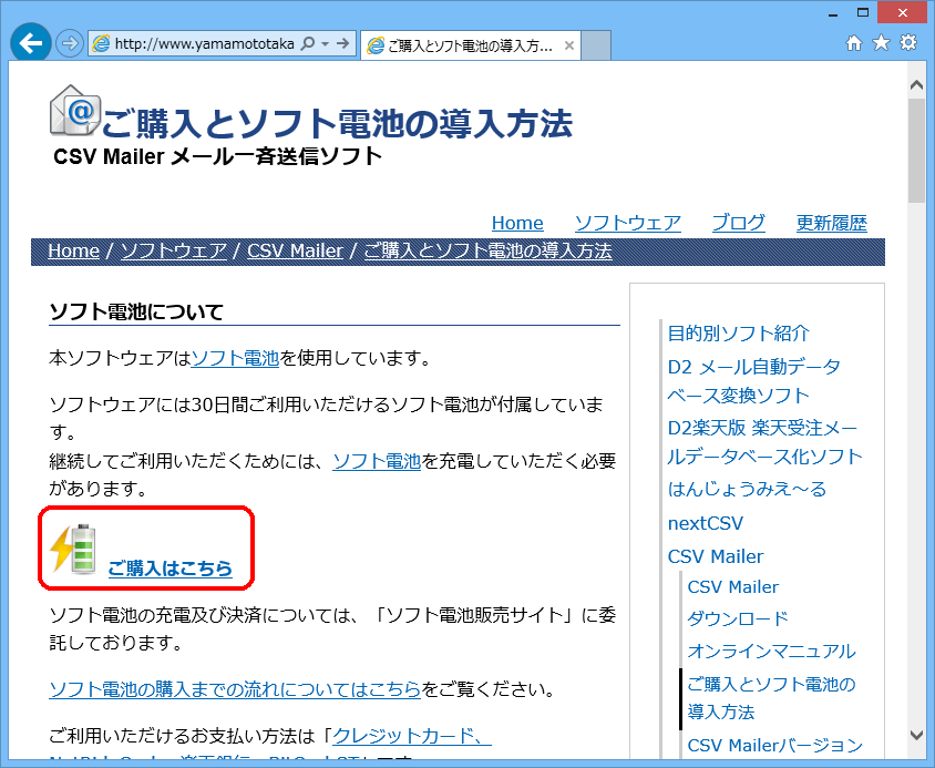 ソフト電池の購入方法を説明するページが表示されます。