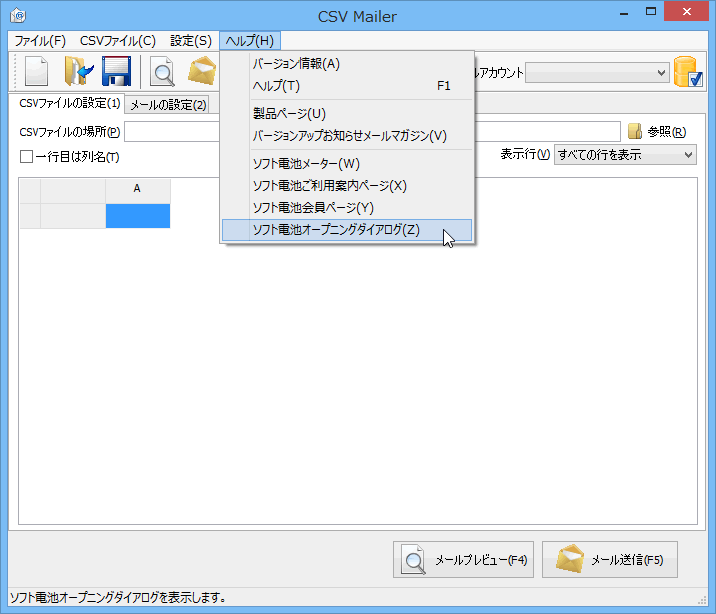 メニューの「ヘルプ」→「ソフト電池オープニングダイアログ」を選択してオープニングダイアログを表示します。