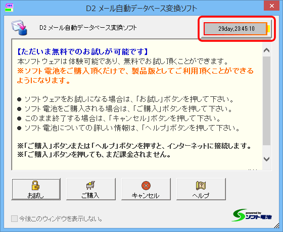ソフトウェアには30日間ご利用いただけるソフト電池が付属しています。