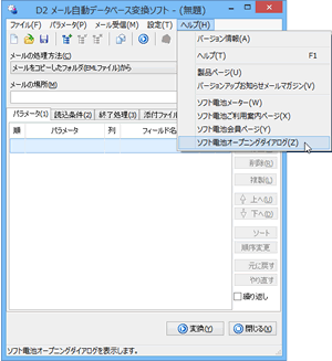 メニューの「ヘルプ」→「ソフト電池オープニングダイアログ」を選択してオープニングダイアログを表示します。