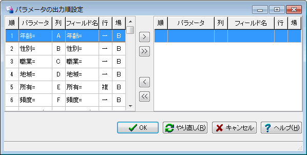 左側の設定前パラメータリストのパラメータ上から順番に、右側の設定済みパラメータリストに移動します。