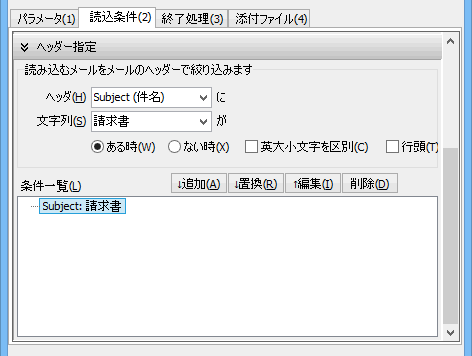「ある時」にチェックをすると、指定したヘッダに検索文字列があるメールが検索対象になります。