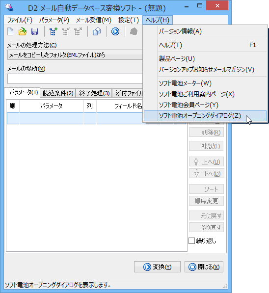 メニューの「ヘルプ」→「ソフト電池オープニングダイアログ」を選択してオープニングダイアログを表示します。