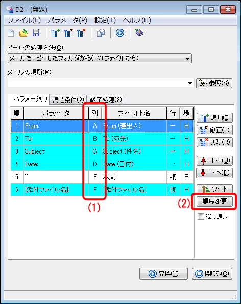 列を変更するには、メイン画面の「順序変更」ボタン(2)を押します。