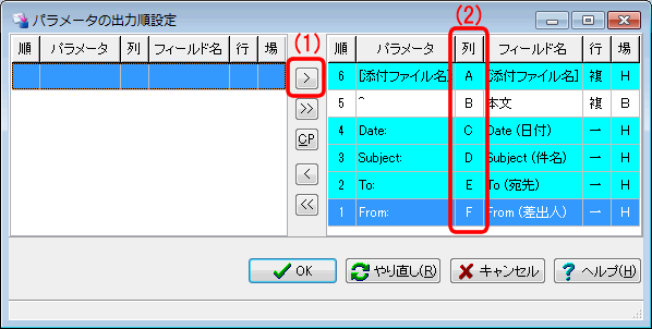 パラメータの出力順設定画面では、出力する順番にパラメータを選択し「>」ボタン(1)を押します。