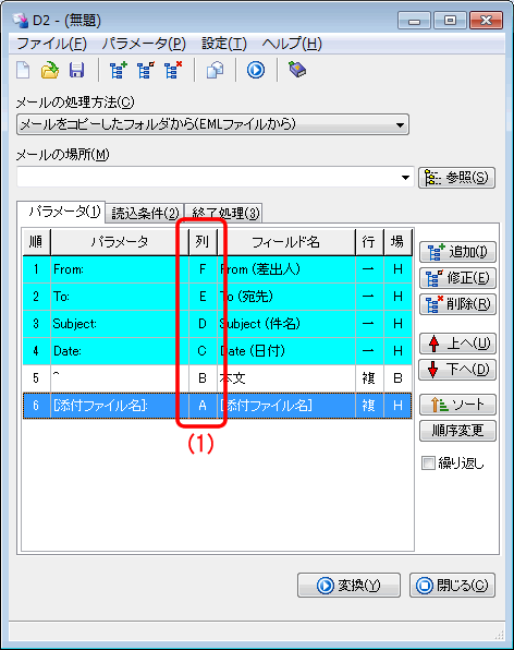 各パラメータの値がCSVファイルに出力される列は、メイン画面の列欄(1)に表示されています。