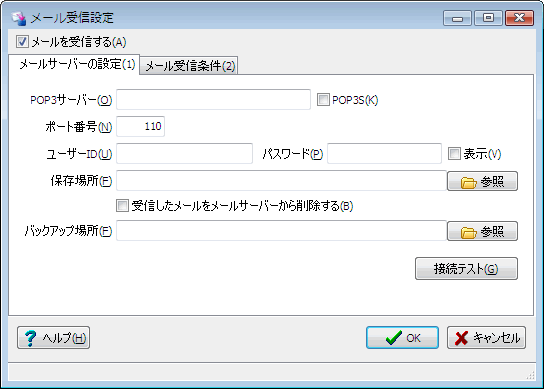 メニューの「メール受信」-「メールサーバーの設定」を選択し、メール受信設定画面でメール受信するための設定を行います。