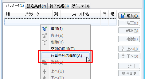 メニューから[パラメータ(P)]-[行番号列の追加(A)]を選択します。 または右クリックから[行番号列列の追加(A)]を選択します。