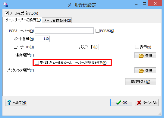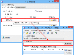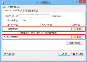 メール受信設定画面には受信したメールを保存する場所として「メールの保存場所」と「バックアップ場所」の2つの設定があります。