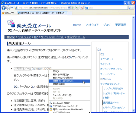 楽天の受注メールに特化した専用ソフト「D2楽天版 楽天受注メールデータベース化ソフト」を公開しています。設定が簡単で高機能となっています。是非お試しください。