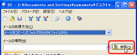メールの場所の「参照」ボタンを押し、メールを保存したフォルダーを選択します。
