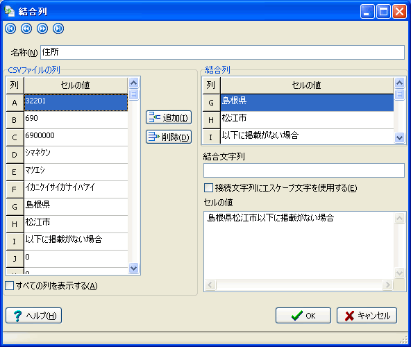 「結合列」の「列一覧リスト」から、作成した住所列を選択します。