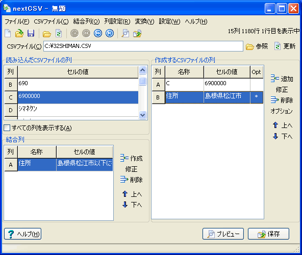 値変換オプションが設定されたため、「作成するCSVファイルの列」の「列一覧リスト」のB列(住所列)に「*」が表示されます。