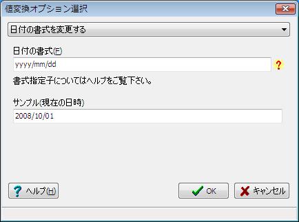 「日付の書式」欄に入力された書式で、現在の日時を表示します。