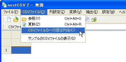 読み込むCSVファイルの一行目が列名の時、メイン画面のメニューから「CSVファイル」-「CSVファイルの一行目は列名」をチェックすると、一行目を列名として扱います。