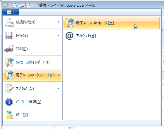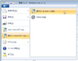 メニューから「電子メールのエクスポート」→「電子メール メッセージ」を選択します。