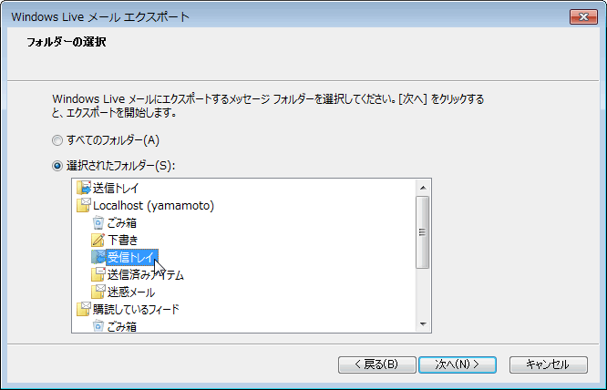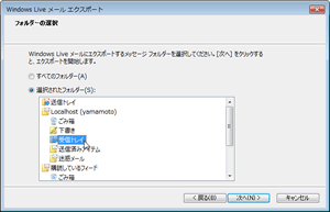「選択されたフォルダー」をチェックして、EML形式で保存するメールのあるフォルダーを選択します。