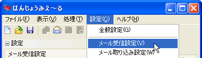 (1)メイン画面のメニュー「設定」-「メール受信設定」を選択します。