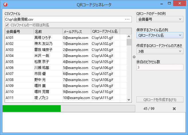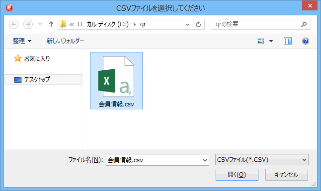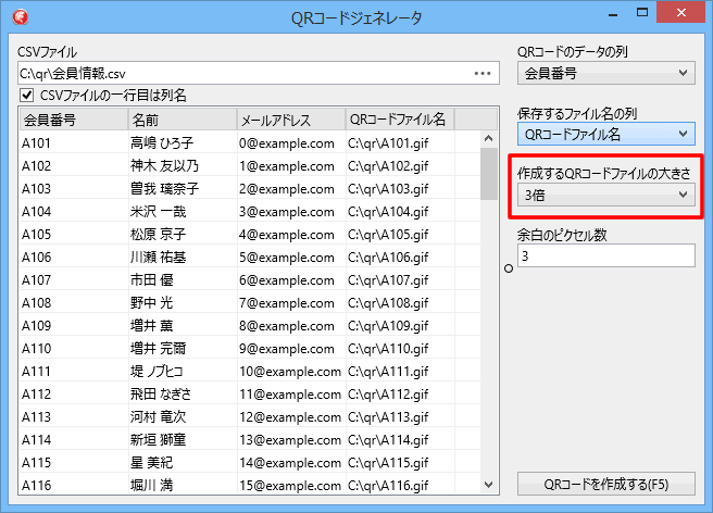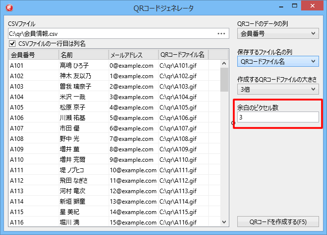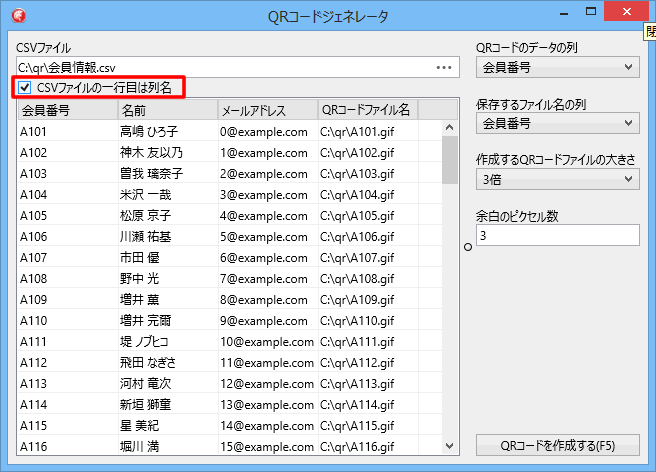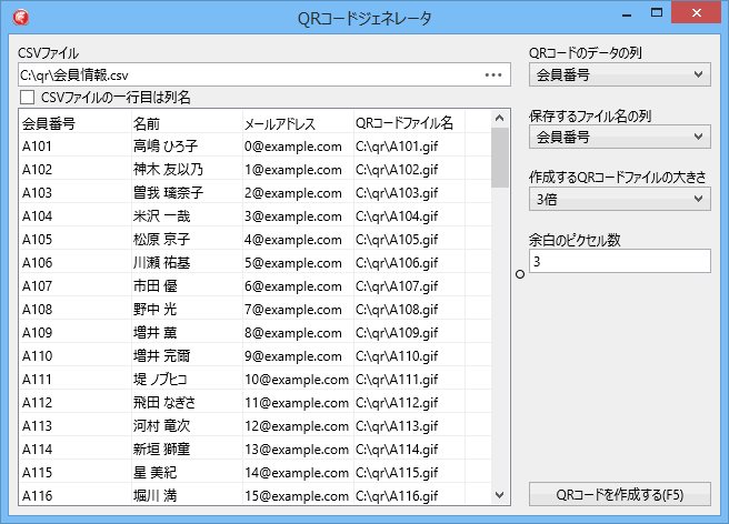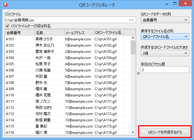 このCSVデータの「会員情報」列の値をQRコードに登録し、「QRコードファイル名」列のファイル名に保存します。